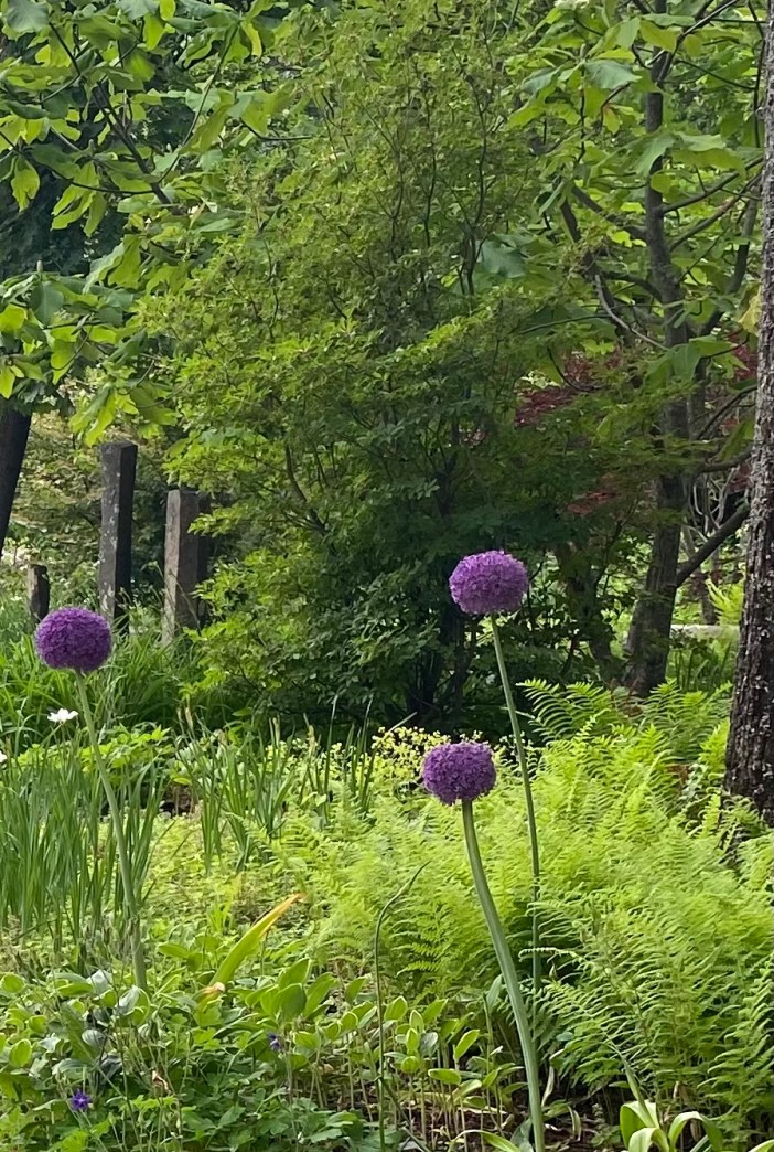 Amongst a quiet woodland garden, bursting early June with ferns, sweet woodruff, spring iris, peony, Solomon’s seal, lobelia and many others. Stands tall giant allium, offering purple magic globes to ponder.