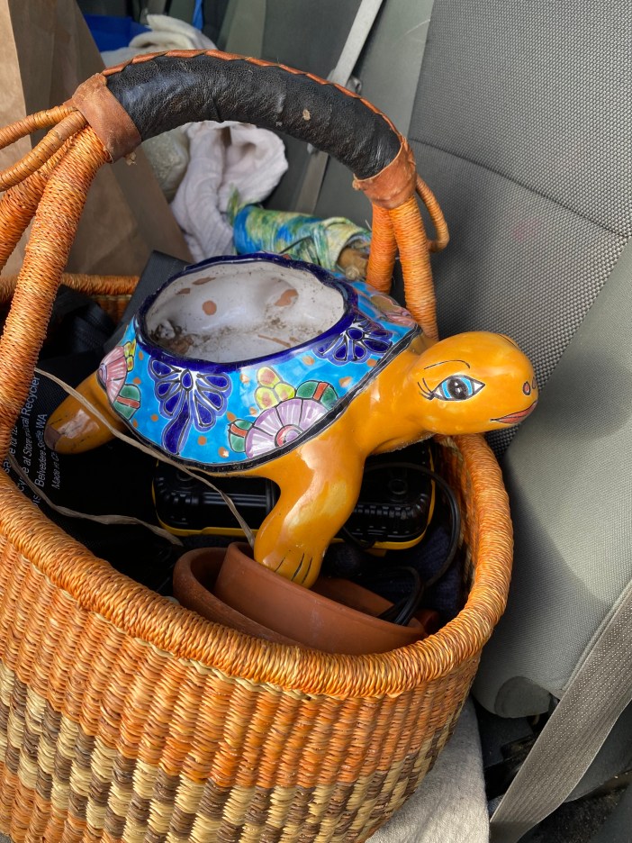 I spot a colorful smiling face tucked on the corner of the hard plastic metal container at the transfer station. No questions asked or thought, just simply come home with me we will give you a good home. She resides on my kitchen table sitting with a gargoyle, she has a little Christmas tree tucked into her back. ππ―π²β€οΈ
